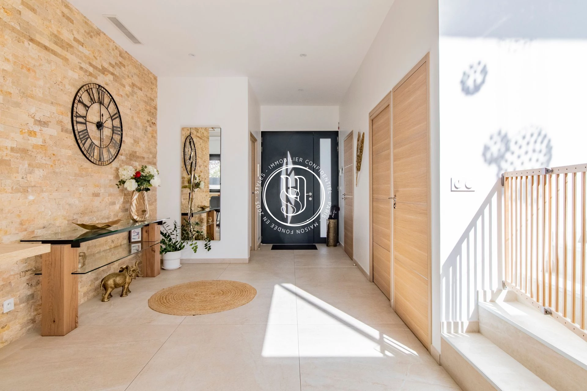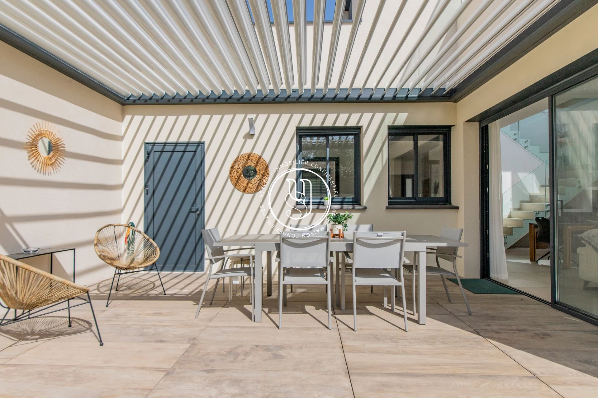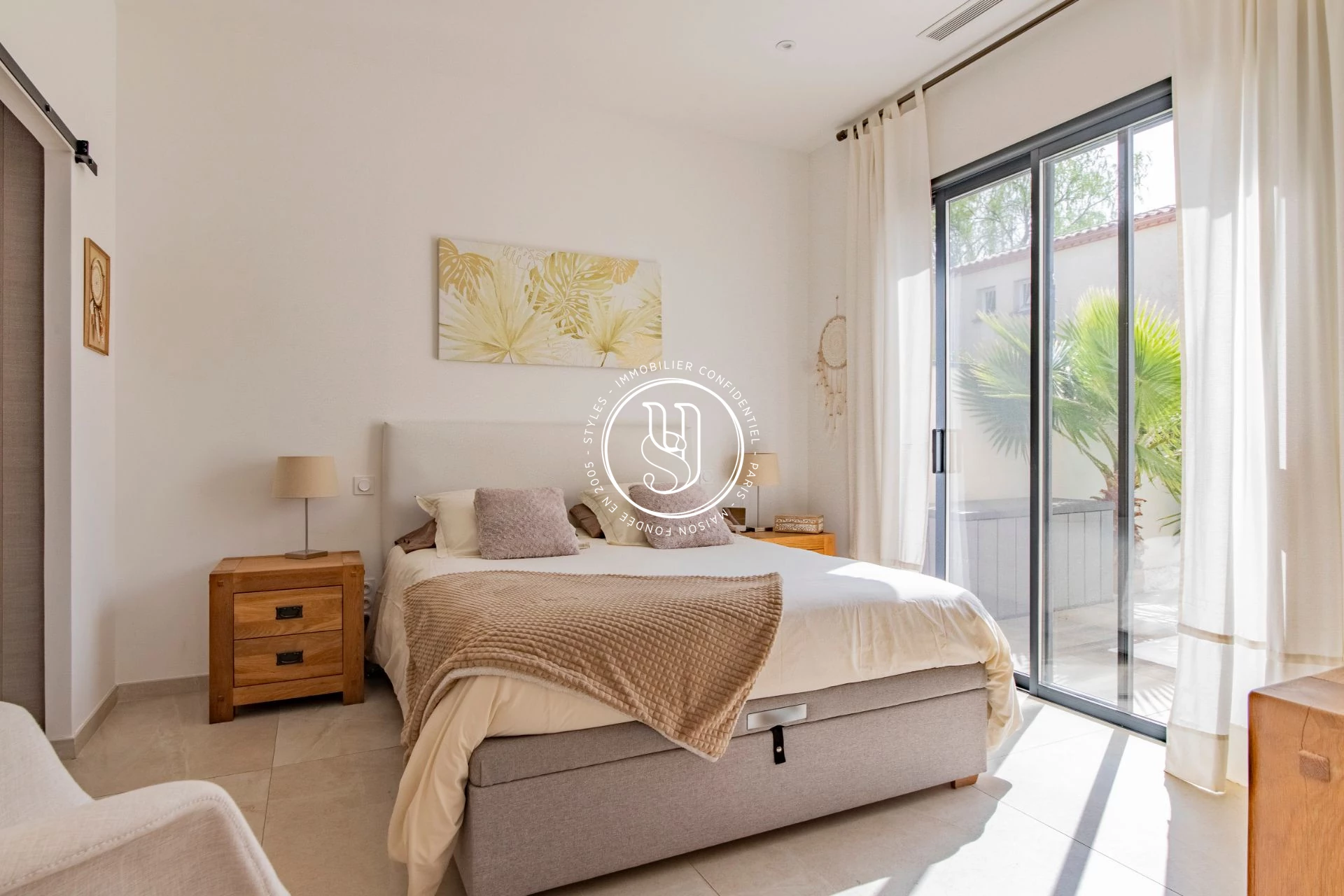 Cuisine haut de gamme toute équipée ouvrant sur un patio. Arrière cuisine et buanderie. Deux suites avec salle d'eau et dressing.