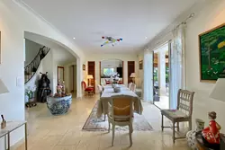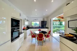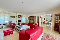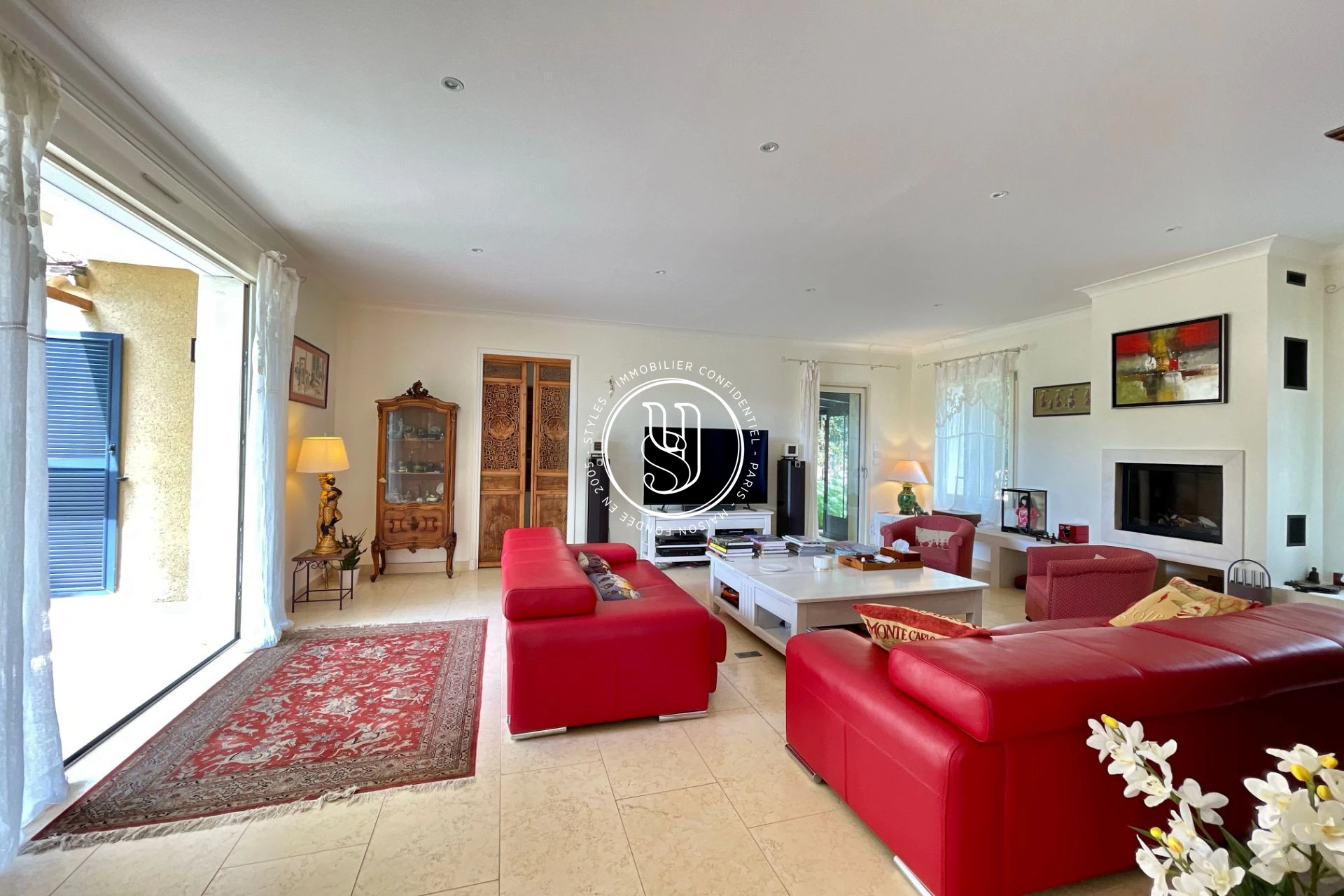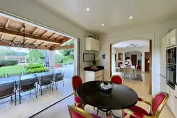 Dès l'entrée, le ton est donné : volumes généreux, lumière omniprésente, finitions soignées. Le rez-de-jardin s'ouvre sur un vaste espace de réception de près de 60 m², articulé autour d'un salon chaleureux avec cheminée, d'une salle à manger élégante et d'une cuisine conviviale pensée pour les instants partagés.