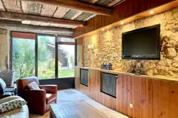 Une vaste cuisine dinatoire et sa grande cheminée sert de lieu de vie tout comme le premier salon cosy et son jardin d'hiver (accès indépendant possible). Un coin chaufferie et des wc complètent ce premier niveau complètement ouvert sur le jardin et sa piscine-bassin.
