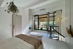 Au dernier étage, la chambre spacieuse dispose de nombreux rangements intégrés et d'une salle de bains attenante. Elle s'ouvre sur une vaste terrasse couverte avec cuisine d'été, idéale pour les repas en plein air tout en profitant d'une vue dégagée sur Uzès.