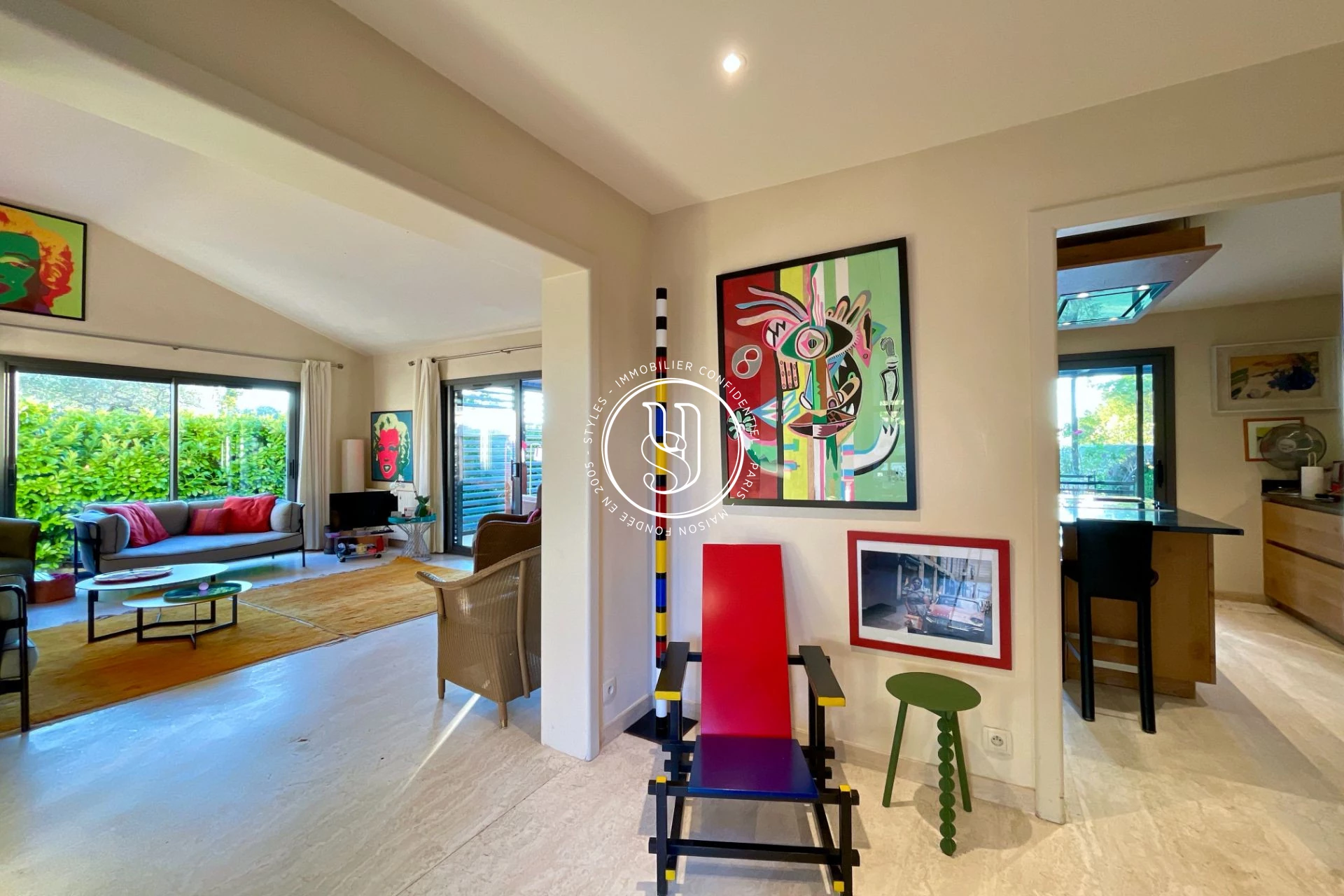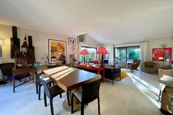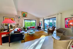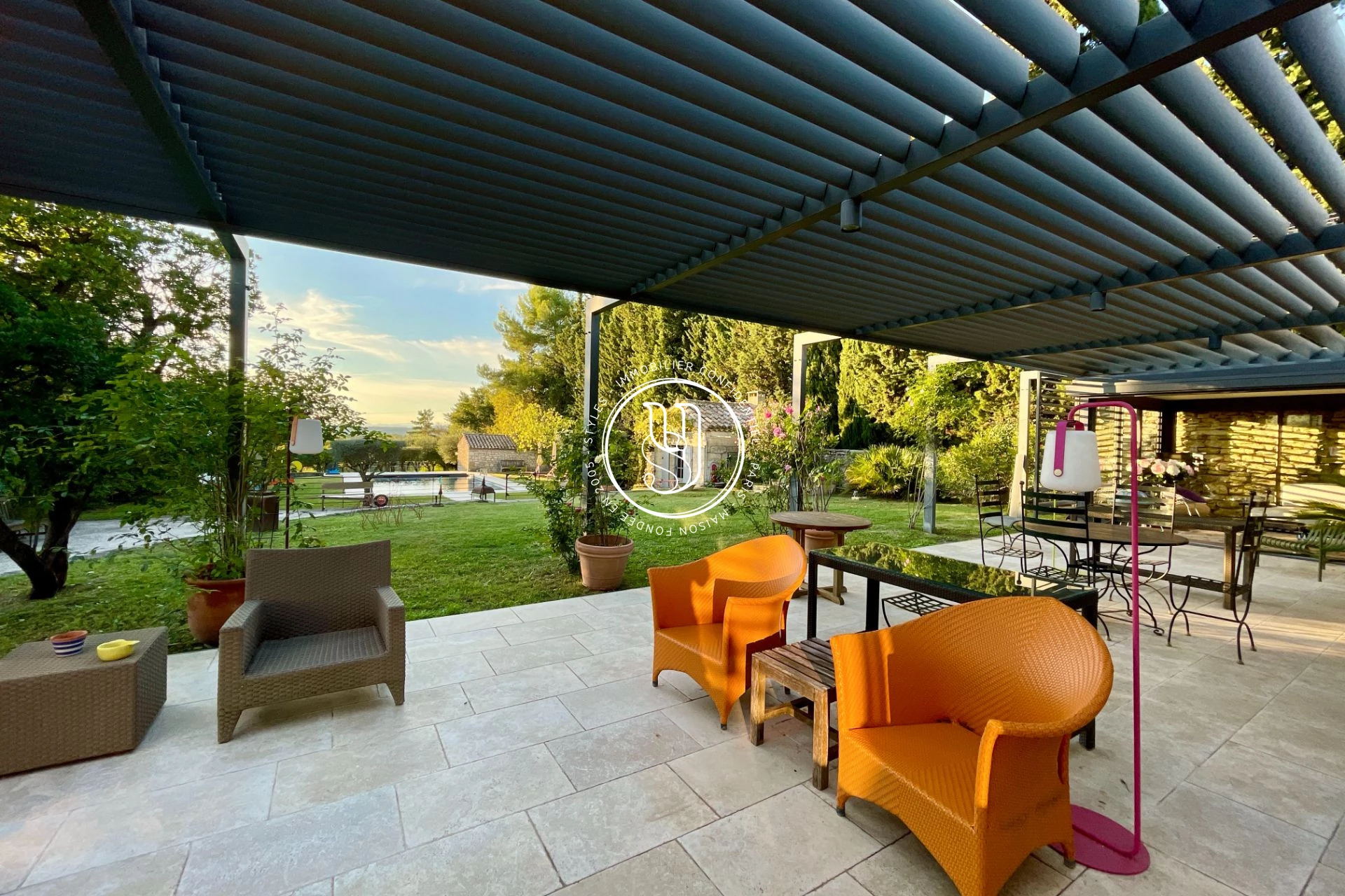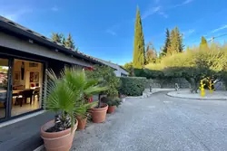 Le portail ouvre sur une cour et des places de parkings dont une couverte, un garage et un studio indépendant avec sa salle d'eau, wc (possibilité de kitchenette) et donne accès au perron de la maison principale. La porte d'entrée ouvre sur une belle entrée, des wc invités, ainsi qu'un vaste salon traversant, et une cuisine indépendante. Ces deux dernières pièces ouvrent sur une vaste terrasse bioclimatique prolongée par un jardin, une piscine et une vue dégagée en perspective. Un couloir donne accès au coin nuit composé d'une master (avec salle d'eau et wc) et sa véranda, un bureau (ou petite chambre), et de deux autres chambres avec placards, salle d'eau avec wc et salle de bains avec wc.