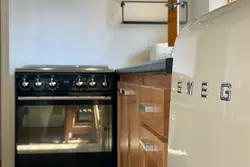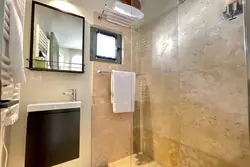 Au rez-de-chaussée, l'entrée s'ouvre sur un espace salon-cuisine lumineux, où le béton ciré moderne côtoie des éléments anciens pleins de caractère. La cuisine, entièrement équipée avec des appareils haut de gamme, s'intègre parfaitement à cet univers raffiné. La chambre, généreuse, prolonge cette atmosphère chaleureuse et contemporaine, tandis que la salle d'eau moderne complète ce niveau.